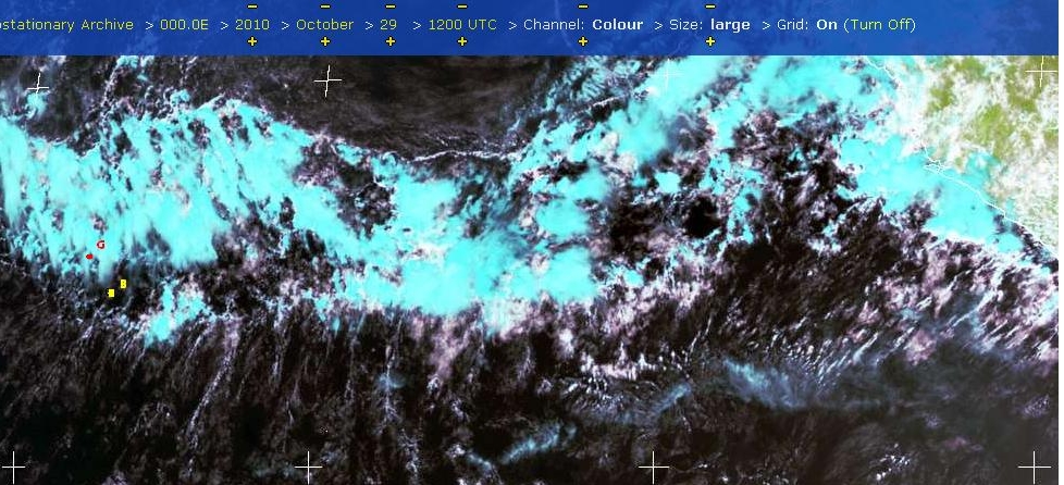 „Jak widać z zapisów trajektorii jachtów na „Race Vieverze” Gutek mimo nadkładania drogi na W na wyraźne obchodzenie komórek cumulonimbusów (na zdjęciu widac niebieskawe pióropusze – kowadła ponad nimi) minimalnie zyskuje mimo słabych wiatrów. Poza tym położenie nieco na W daje mu trochę lepsze warunki na szybsze złapanie pasatu SE z drugiej strony. Na drodze Brada jeszcze ogony chmur burzowych, które zasysając wiatr pod swój komin wznoszącego sie powietrza mogą dać mu wiatry bardziej od dziobu niż Gutkowi. Tak więc wygląda, że weekend obaj zawodnicy spędzą już powoli narastającym pasacie.