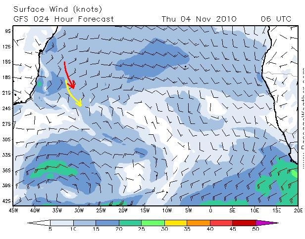Przedstawiam 2 mapki – aktualną i prognozowaną na 0600 UTC 4.11.2010 by można było porównać jak zmieniają się prognozy na krytyczny moment brania zakrętu w porównaniu z poprzednim opisem.