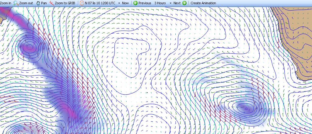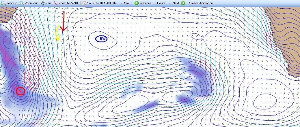 Potem już tylko wybór momentu do skrętu na wschód by jak najdłużej uciekać w wietrze N o optymalnej sile do prędkości łódki przed frontami ciepłym i chłodnym nadchodzącego niżu, w rosnącym stanie morza (zafalowani) które dodatkowo skotłuje się po przejściu frontu chłodnego i skoku wiatru na W.