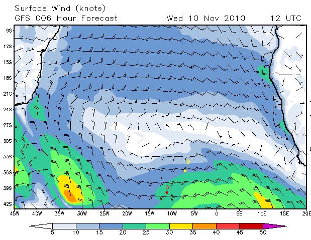 Brad odpadłszy od ogona niżu znajdzie się w zasadzie w rejonie umiarkowanych wiatrów na skraju Wyżu św. Heleny. No, ale on ma wszystkie duże żagle i powinien niewiele stracić na prędkości. Tak więc trudna walka trwa – małe żagle w silnym wietrze, duże w słabszym, prędkości podobne.