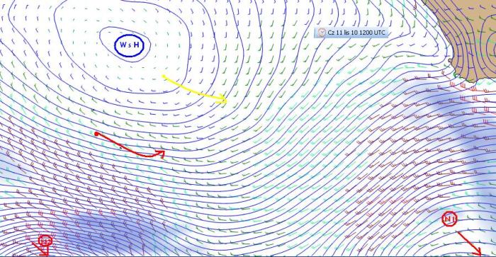 Wydaje się, że niż N1 który ujeżdżali obu im ucieka. W przypadku będącego bardziej na zachód i południe Gutka następne silne wiatry przyniesie następny w kolejce niż N2. Gutek znajdzie od jutra się w jego strefie przedfrontowej z silnymi wiatrami NW, więc zrobiwszy rano zwrot z wiatrem może spróbować płynąć bardziej bezpośrednio na metę.