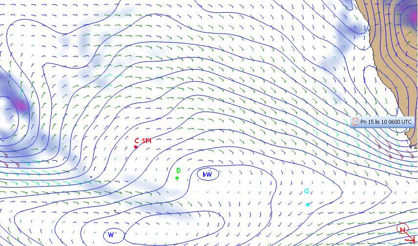 Gutek zanurkował znowu na południe na prawym halsie słusznie odchodząc od słabych wiatrów w osi klina wyżowego i łapiąc pozostałości silnych wiatrów odchodzącego niżu N->. Na drodze pozostałych rywali – Dereka i CSM – bąbel wyżowy bW – i nieco na SW solidny ośrodek wyżowy W. Czekają więc ich w najbliższej dobie, a Dereka chyba już, wiatry słabe (lub do wyboru nieco mocniejsze ale przeciwne).