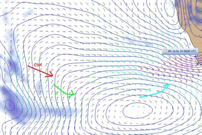 Jutro ośrodek wyżowy zasilony zimnym powietrzem z czterdziestek skonsoliduje się dając rywalom Gutka szanse podążania za sobą na wschód w umiarkowanych wiatrach z północy wzmacnianych przez nadchodzący z zachodu trzeci (w czasie obejmowanym komentarzami) niż. Gutek będący we wschodniej ćwiartce ośrodka wyżowego powinien znaleźć dobry dla jego małych żagli silny wiatr SE wiejący na obrzeżach wspomnianego wyżu wzmacniany współpracą z odchodzącym niżem numer 2.