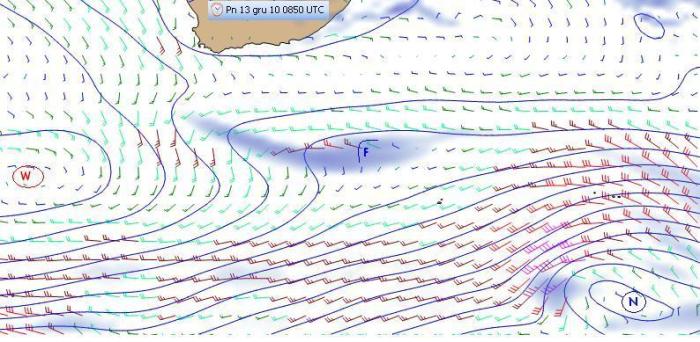 Ponieważ jednak na półkuli południowej jest wczesne lato, to front polarny, na którym budują się niże ryczących czterdziestek, charakteryzuje się znacznym jeszcze kontrastem termicznym między zimnym powietrzem antarktycznym, a ciepłym oceanicznym. Na rozciągniętym froncie ciepłym owego odchodzącego na wschód niżu powstaja zafalowania F (jak lokalne niże) wzmacniajace i tak silny wiatr SW-S-SE wiejący po wschodniej ćwiartce wyżu. Będzie się więc rozwiewać w okolicy przylądka. Widać to dobrze na mapkach na wtorek.