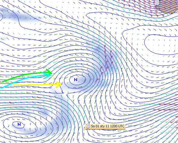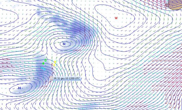 Prognoza na Nowy Rok pokazuje przesuwające się na SE siodło między niżami wpływające na decyzje żeglarzy. Być może logiczne wydaje się w dalszej perspektywie zboczenie na N (tak jak idą obecnie Derek i Gutek), by nie mieć kłopotów ze słabszymi wiatrami siodła i nie schodzić w 50-siątki, gdzie w perspektywie 2 dniowej (ostatnia mapka) wiatr może osłabnąć i nie dawać szans na podejście do obowiązkowej bramki bezpieczeństwa (pokazywanej dobrze na mapce przeglądowej regat).