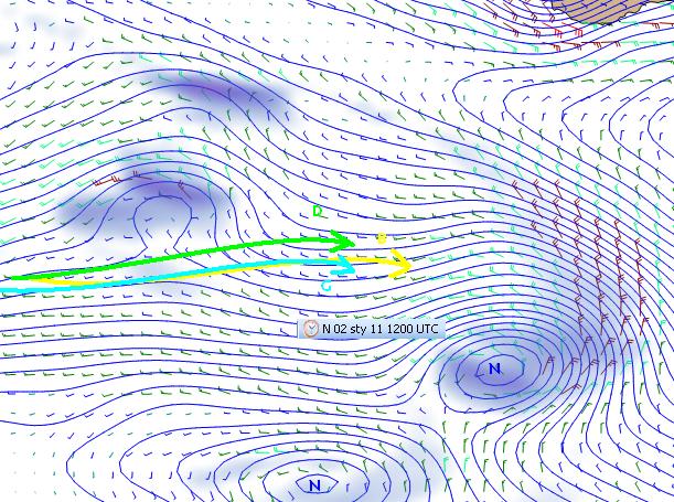 Spowolnieni prze klin wyżowy zawodnicy zostali dogonieni przez podwójny układ niżowy podchodzący z zachodu. Bradowi udaje się jeszcze utrzymywać w silnym wietrze N przed frontem ciepłym. Pościgowa dwójka pod chmurami i deszczem frontu ma wiatr około W i pewnie większą falę. Obaj utrzymują lewy hals. Derek jest bliżej siodła między dwoma niżami ze słabszym i bardziej kręcącym na S wiatrem, może go to trochę przytrzyma i odrzuci na północ.