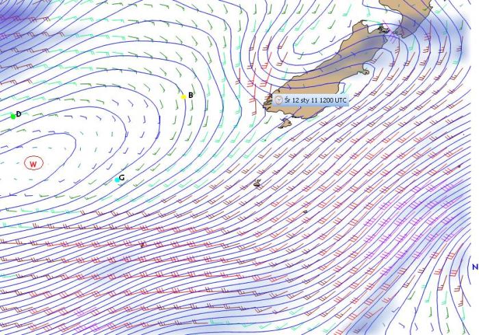 Brad jest po właściwej stronie wyżu i ustawiony do przejścia przez Morze Tasmana. Gutek też po właściwej i ma jeszcze możliwość wybrania opcji drogi na wschód od Wyspy Południowej NZ w silnych wiatrach między odchodzącym na E niżem a wyżem tasmańskim. Derek przez przedwczesne podjechanie na północ znalazł się po niewłaściwej stronie dość szybko poruszającego się wyżu i ma teraz przeciwny wiatr, pod który halsuje, choć powinien chyba uznać swój błąd i obchodzić wyż od południa, gdyż porusza się on na NE i na kursie 20 będzie go ciągle blokował.