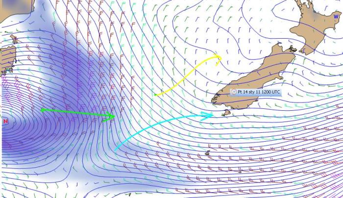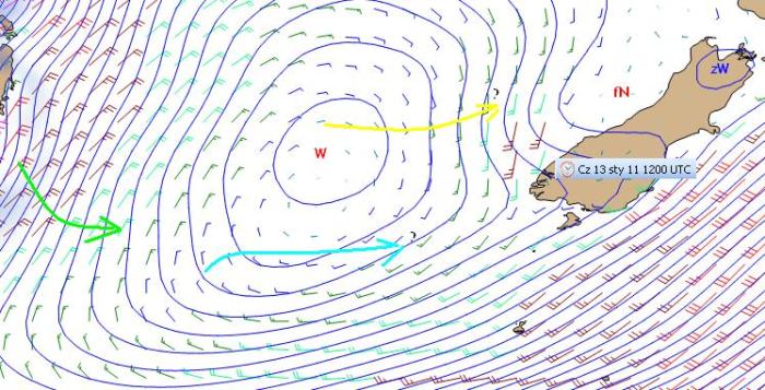 Sytuacja jest ciekawa, jako że na zachód od wyspy prognozowane jest wytworzenie sie ciekawej sytuacji meteorologicznej. Na froncie chłodnym odchodzącego na E niżu w zetknięciu z ciepłym powietrzem nad wyspą powstanie zafalowanie, zaczątek niżu (fN), a w zimnym powietrzu przyniesionym tym frontem przez Cieśninę Cooka zaczątek wyżu (zW). Taki układ spowoduje ograniczenie silnych wiatrów na zachód od wyspy do jej części południowej. Po tej samej stronie w części północnej prognozowany jest słabogradientowy obszar znoszących się nawzajem słabych wiatrów, tak jakby zderzenie wiatrów ze składową E z cieśniny z wiatrami SW wzdłuż brzegu.
