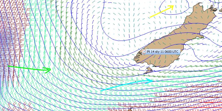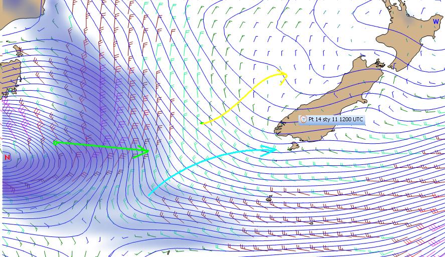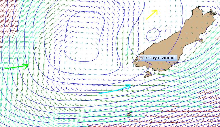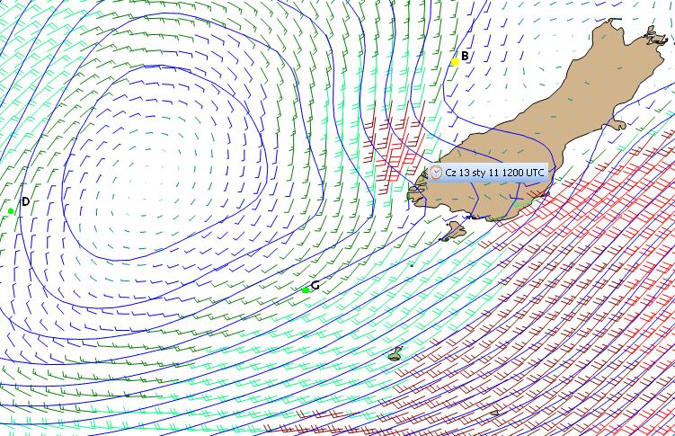 Dzisiaj (czwartek godz. 22.00 czasu chicagowskiego) wykonałem kolejna symulację odnosnie kursu który obrał Gutek.. Oczywiście trzeba pamiętać, że jest to symulacja – realna pogoda może znacznie odbiegać od virtualnej. Na razie symulacja wskazuje, że dla Operona kurs południową stroną wyspy South Island jest racjonalny. Wygląda to jak poniżej: