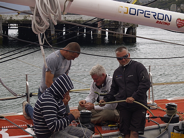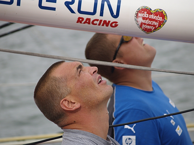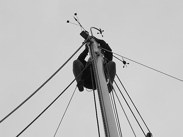 Wczoraj, w niedzielę, Brad pracował z Gutkiem i chłopakami nad NKE. Po pół dnia roboty, wejściu Świstaka na maszt i zdjęciu części osprzętu z góry – oraz po serii testów na pokładzie – udało się zlokalizować przyczynę awarii NKE. Jest to jedna część systemu, mocowana na topie masztu, tzw. baza mast-unitu składająca się z elektromagnesu, wiatraczka oraz wskaźnik wiatru. Było to nowe urządzenie, zakupione specjalnie na te regaty. Ponieważ jest na gwarancji, zostanie oddane do reklamacji i na razie zastąpione zapasowym sprzętem. Różnica między jednym a drugim jest taka, że to co się zepsuło to sprzęt „racingowy” czyli super profesjonalny (szybszy odczyt, większa dokładność). To co teraz pójdzie na górę to sprzęt „cruisingowy” czyli teoretycznie turystyczny (trochę wolniejszy) ale mniej awaryjny – również teoretycznie.
