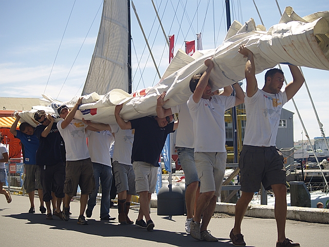 Ilu potrzeba – można policzyć na zdjęciu. Grot z Eco 60 waży około 250 kilogramów. Dzisiaj jeden został zaniesiony na Pingwina, jeden na Operona. Oba już naprawione, pomalowane, super. Przestało tak strasznie wiać, więc zaraz Operon jedzie na kalibrację systemów nawigacyjnych. Przy okazji kręcony ma być program nowozelandzkiej TV.