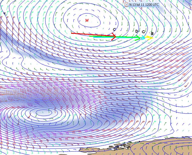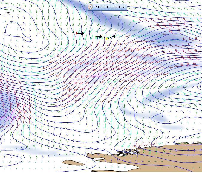 Nad żeglarzami przeszedł już front chłodny, siła wiatru będzie narastać i skręci z bieżącego SW na SSW, a więc praktycznie do półwiatru.Zawodnicy ustawili się praktycznie w jednej linii i żeglują prosto na E, za wyjątkiem Brada, który korzystając z uzyskanej przewagi stara się jeszcze jechać jak najdłużej baksztagiem nieco tracąc do pozostałych ale oszczędzając siebie i łódkę.