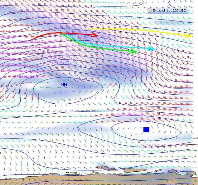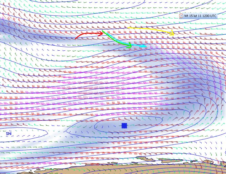 Nowy niż połączy się ze starym i zacznie wygasać pod Antarktydą (centrum układu z niebieskim kwadratem).Chwila wytchnienia dla żeglarzy. Ale już na środę prognozowane jest powstanie na froncie chłodnym wygasającego układu następnego aktywnego niżu NN z bardzo silnymi wiatrami. A więc zapowiadają się następne dni bardzo szybkiej jazdy w sztormowych i (rzadziej) półsztormowych warunkach.