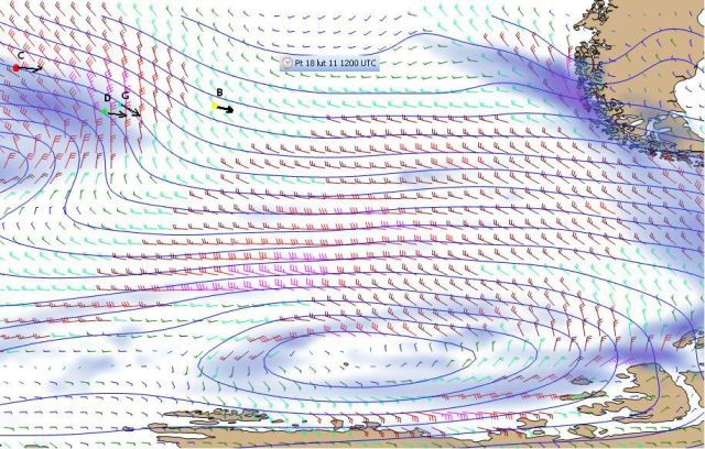 Odkształcając pole ciśnienia przy powierzchni oceanu mogą one spowodować wystąpienie strefy słabszego, nierównego wiatru. Wydaje się, że Brad może jej uniknąć trzymając się nieco na północ, a Gutek i Derek na południe od niej. W każdym razie należy być czujnym, by przy tak wyrównanej stawce nie stracić cennych mil. Najłatwiej może mieć Chris, będący poza tym bałaganem, a wiatr mu nieco powinien osłabnąć.