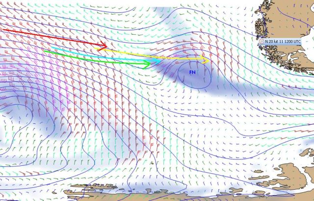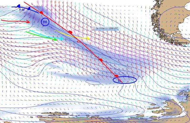 Natomiast w poniedziałek Brad powinien zbliżać się już do Hornu w ogonie przeciskającego się przez Cieśninę Drake’a niżu wtórnego FN. Gutek i Derek powinni się ścigać w nieco lżejszych warunkach między niżami, a Chris ma szansę utrzymać się przed frontem ciepłym następnego niżu, który podobnie jak poprzednik zwolni przed cieśniną i może pokazać się tak jak poprzednio jako zaburzenie falowe FN2 oraz rodzący się z następnego takiego zaburzenia nowy niż NN.