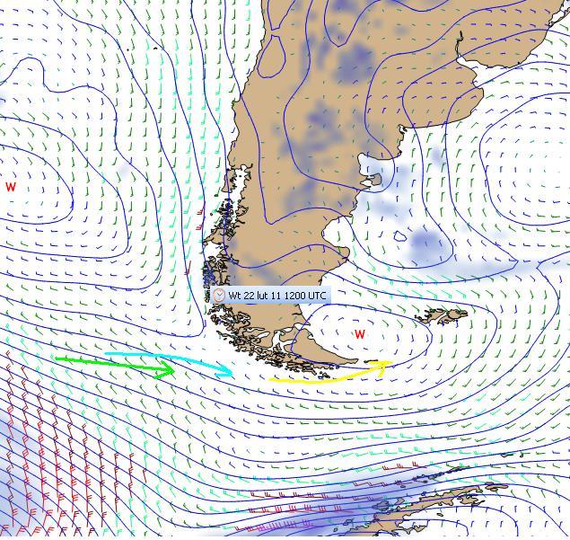 Jutro Brad zgubi w końcu niosący go niż, który odleci na wschód. Pochód niżów nawrzucał już za swoimi frontami chłodnymi tyle zimnego powietrza z Antarktydy, że wystarcza go na potężny wyż na Pacyfiku klinem sięgający Hornu i samodzielny ośrodek wyżowy między Falklandami a wybrzeżem Ameryki Południowej. Wydaje się, że w całej grubości troposfery mającej wpływ na pogodę przy powierzchni oceanu nastąpi przejściowe uspokojenie. Wyże wydmuchają wiry niżowe na wybrzeże Antarktydy i żeglarze mogą mieć spokojną pogodę na obchodzenie Przylądka, zakłócana tylko posztormową falą z krzyżujących się kierunków W i NW.