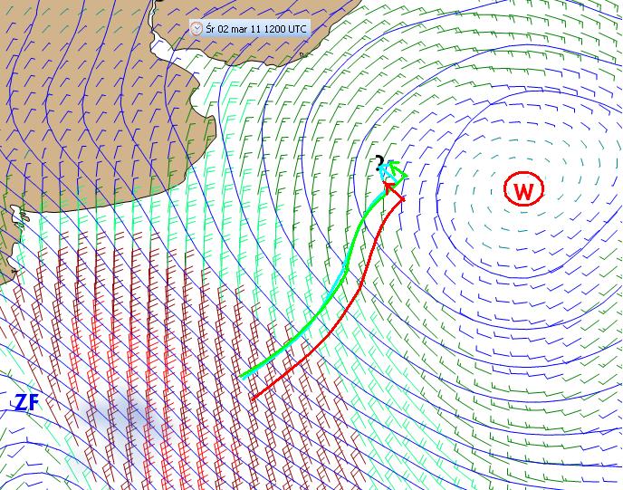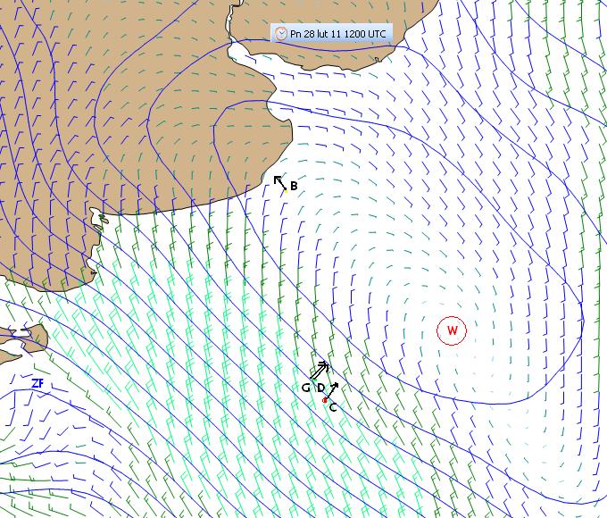 Brad w ćwiartce NE i idzie konsekwentnie na północ gdzie w końcu musi dostać wiatry wschodnie opływające północną część wyżu. Pozostali w silniejszych wiatrach północnych z odchyleniem ku zachodowi ćwiartki SW wspomaganych zaburzeniem falowym ZF spod Patagonii. Gutek i Derek pewnie się widzą i jest to już walka wręcz na szybkość i ustawienia łódek. Chris nieco na południu ma nieco silniejszy i pełniejszy wiatr.