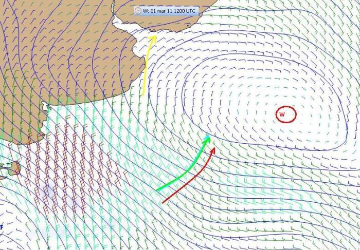 Pewnie pojutrze kluczowym momentem będzie wybranie momentu zwrotu na prawy hals w stronę mety. Centrum wyżu będzie dość stacjonarne, ale przy brzegach kontynentu izobary mają się zagęścić i dać silniejsze wiatry z kierunku N, kiedy zawodnicy znajdą się na północ od centrum wyżu NNE, co będzie sprzyjać takiej decyzji.