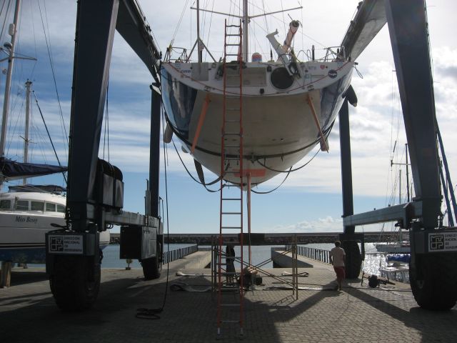 Procedura administracyjna związana z podniesieniem jachtu zajęła pół dnia – co jest tutaj normą. 12 stron formularzy, podpisy, kapitanat portu, prefektura policji, straż portowa, po kolei. Drugie pół dnia ustalaliśmy jak będzie przebiegało slipowanie. Trzeba się było uczyć hiszpańskiego!