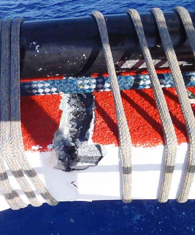 Wygląda na to, że bukszpryt nie ma sztagu i w sztormie, wbijając się w fale, pracował jak szpadel. Zgiął się do dołu i górna płaszczyzna rozerwała się. Dwa minisztagi przywiązane do górnej części kosza dziobowego usztywniłyby bukszpryt przed kolejnym łamaniem w fali.