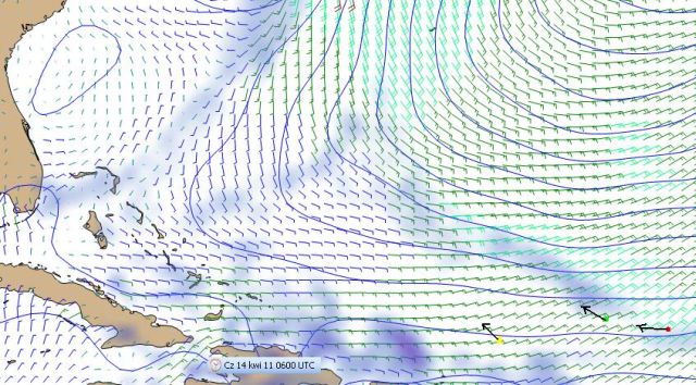 W weekend przed żeglarzami chwilowo słabszy wiatr na w strefie zbieżności między wyżem atlantyckim a rodzącym się na wybrzeżu stanów niżem, a potem jazda w wiatrach rozwijającego się niżu kręcących systematycznie na S i potem klasycznie na W i NW. Ale o tym postaram się napisać szczegółowiej jutro.