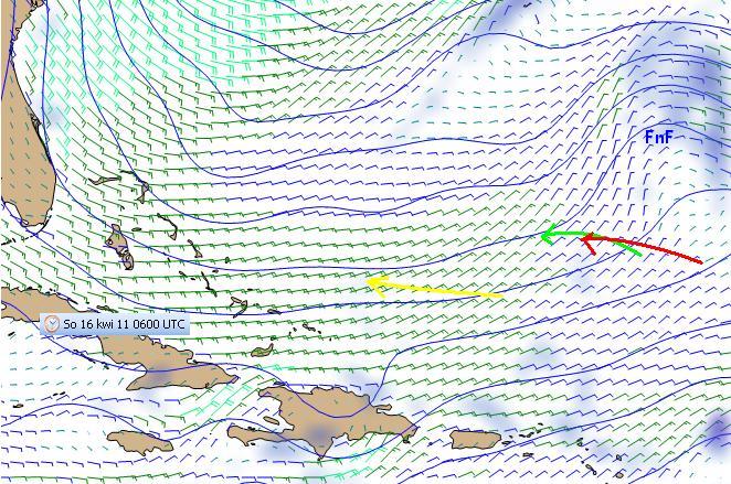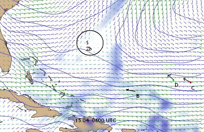 W poniedziałek Brad po przeczłapaniu się przez klin wyżowy może spotkać następna przeszkodę w postaci strefy zbieżności wiatrów opływających klin o kierunku SE z wiatrami NNE za frontem chłodnym niżu opuszczającego wschodnie wybrzeże Stanów. Da to szansę parze CD na dalsze zmniejszenie dystansu.