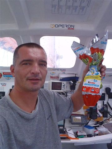 Gutek już za równikiem. Dziesiąty raz. Mówi, że nawet statki się pochowały do portów. Miał za to pasażera na gapę – zabłąkanego ptaszora, który najpierw go wystraszył, bo siedział na nadbudówce i w środku nocy zaczął machać skrzydłami, a potem spokojnie siedział na tratwie i odpoczywał. Jajko na zdjęciu jest prezentem z Punta del Este od Chrisa Stanmore-Majora.