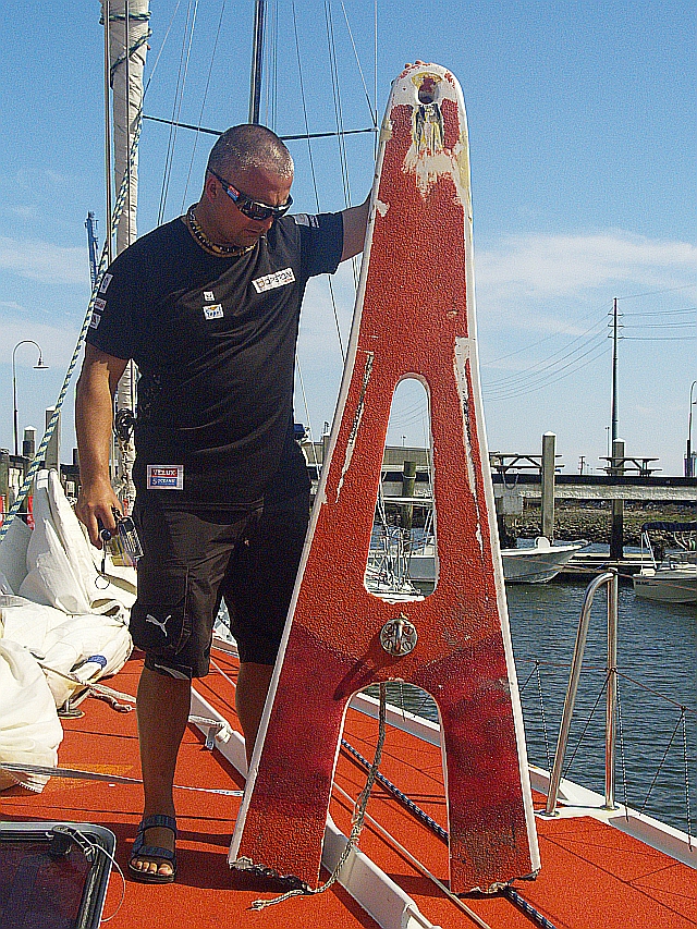 Do naprawy jest bukszpryt – rano będzie decyzja, czy lepiej aluminium czy laminować z wpuszczeniem mocowania w kadłub. Oprócz tego Raymarine oraz stery wymagają kalibracji – co spowodowane jest koniecznością resetu systemu autopilota mówiąc najogólniej. Dzisiaj kolega Świstak uszczelnił skrzynię kila, która trochę przeciekała. Konieczna jest też wymiana rury doprowadzającej wodę chłodzącą do silnika oraz wymiana jednej z rur pompy zęzowej. Ostatnią rzeczą na liście jest sprawdzenie całego masztu, okuć itp ze szczególnym uwzględnieniem szyny grota oraz wymiana jednego z wózków grota. Tak więc od jutra rana – do dzieła!