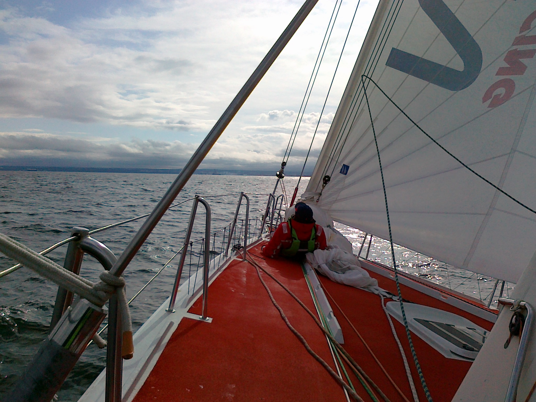 15.30 ! Wypływamy z Helu, wiatr tężeje, morze 4-5. Stawiamy żagle, lewy hals, kierunek Gdynia. Operon tnie fale prowadzony przez autopilota Raymarine, zawietrzna burta zanurzona, aż po słupki relingów, ale jazdaaa ! Cała załoga balastuje!!! Gutek stoi w kokpicie i opowiada o hiszpańskim systemie podatkowym, który sprzyja rozwojowi żeglarstwa w tym kraju.