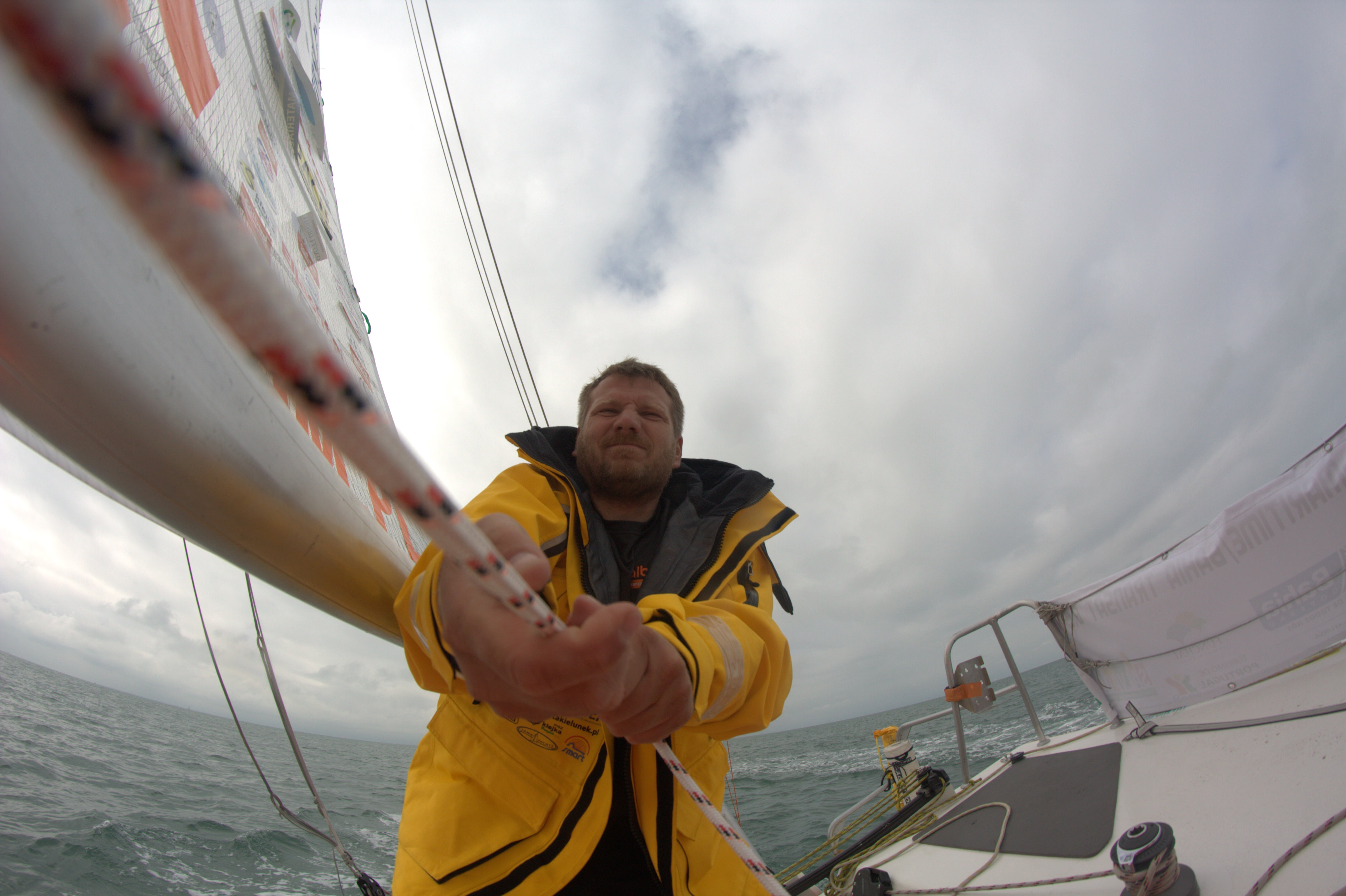 A na południu, na południu wreszcie powiało. Mój bolid w środku nocy wpłynął na „przestronny przestwór” ruchomego powietrza o sile 13,5 w! I pomknął w dół po skosie z prędkością niewyobrażalną – 9,1 knota! Co za noc, co za sen. O 4-ej nad ranem ustawiłem kurs, uzgodniony z autonawigatorem, na 214 stopni i rzuciłem się do koi z myślą, że jestem już 295. Szok. O 7:20 budzik w telefonie przypomniał o nawigacji… wyłączyłem go i jeszcze chwile zmrużyłem oczy… śniły mi się jakieś jachtowe sytuacje, byłem bardzo ciekawy dalszego ciągu, aż tu spoglądam jak przez mgłę na zegarek i widzę godzinę 9-ą… Zmiana wiatrów o 8:00 przespana… Zmiana strategiczna, więc mam przechlapane… ale klapa… jak mogłem na to pozwolić? Byłem pewien, że zjechałem o kilkaset miejsc do tyłu i położyłem całą zabawę już na Biskajach… Tak bywa.