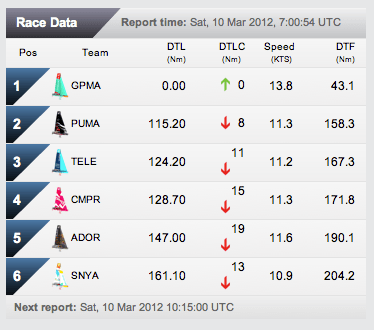 Załoga „zielonego komara” potwierdza, że jacht był wystawiony na bardzo solidną próbę zarówno w trakcie pierwszych kilku dni po starcie z Sanyi jak i kilku ostatnich dni, tuż przed metą (oranie pod wiatr i dużą falę). Na szczęście przeciek w przedziale dziobowym został opanowany, a gródź wodoszczelna zamknięta. Cała operacja trwała dwie godziny. Ale w dalszym ciągu Francuziki tuż-tuż, i chyba dowiozą zwycięstwo do mety. To dość zabawne, bo u nich na pokładzie jest tylko dwóch Nowozelandczyków, a na wszystkich innych jachtach ok. 8 – więc gdyby wygrał ten etap ktokolwiek inny, można by trąbić, że Kiwi górą :)))