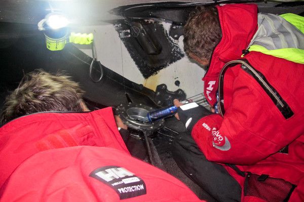 Po drugie, Sanya Lan złamała dziś jedną z dwóch płetw sterowych, czego skutkiem jest woda w przedziale rufowym. Awarię zgłoszono dziś o godzinie 08.00 UTC, przyczyna na razie nie jest znana. Jacht w tym czasie miał prędkość 20-25 węzłów, wysokość fal 2,5-3m. Załoga pompuje, woda nie dostaje się dalej, próbują naprawiać. Jachty typu VO70 mają dwie płetwy sterowe plus jedną awaryjną. To trzecia z kolei awaria Team Sanya w tych regatach – mogą mówić o wyjątkowym pechu (najpierw dziób w 1 etapie, potem takielunek w 2, teraz ster).