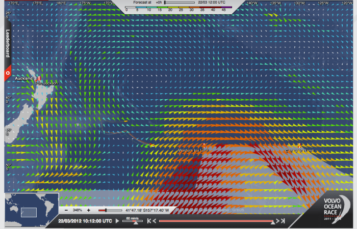 Na trasie VOR trochę się dzieje i będzie działo jak widać na mapce. Wyraźnie widać niż i granicę bezpieczeństwa wyznaczoną przez raporty lodowe (szary kolor). Ale po kolei: