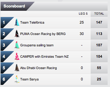 Piąty etap nie był łatwy – do mety dotarły trzy z sześciu jachtów, w tym jedynie jeden (Puma) w całości. Telefonica zaraz za Hornem miała przystanek celem laminowania kadłuba, a Groupama w odległości 60 Mm od Punta del Este złamała maszt. Ale uszkodzenie było na tyle „szczęściem w nieszczęściu”, że po wejściu do portu i przy pomocy zespołu brzegowego, w tym żaglomistrzów i speców od takielunku, udało się zamontować osprzęt awaryjny, na którym dojechali do końca (nie bez znaczenia była też dobra pogoda i właściwy kierunek wiatru). Teraz zaledwie 20 punktów dzieli Francuzów od Hiszpanów, więc zapowiada się ostra walka w każdym kolejnym etapie. Do końca jeszcze tylko cztery, będzie się działo, mam nadzieję, że łódki to wytrzymają.