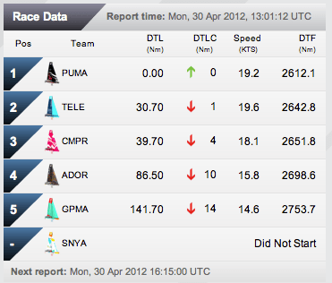 Tymczasem wszyscy już za równikiem, z powrotem na „naszej” półkuli. Prowadzi wciąż Puma – wielki szacunek za ten etap, w tym również za wczorajszą „ucieczkę” – zostawili już-już dopadającą ich Telefonikę (ok. 2Mm różnicy wczoraj) o ponad 30 mil z tyłu.