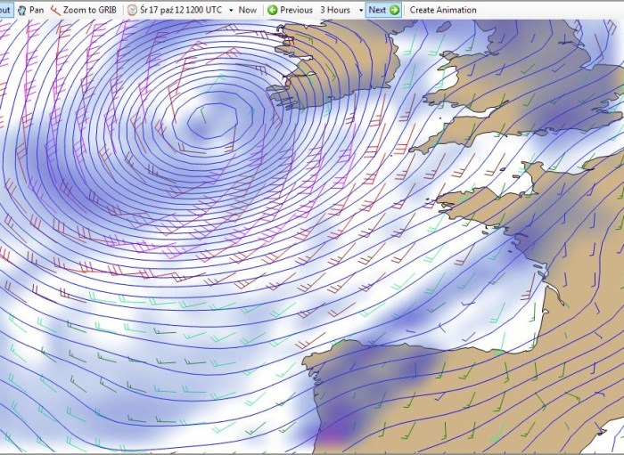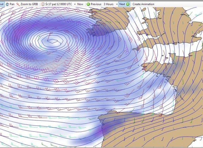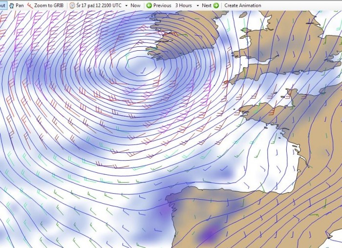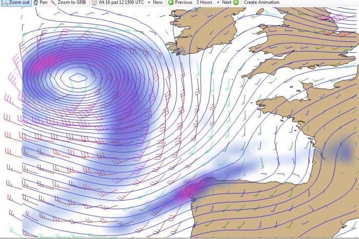 Na moje prośby o analizę pogody powiedział: „Ściągnij wreszcie uGriba”. A więc ściągnęłam i bardzo polecam. (Działa jednak tylko na komputerach PC.) Poniżej efekty oglądania zmian w pogodzie na wyjściu z kanału La Manche i Zatoce Biskajskiej od dzisiaj (godz. 1500) do czwartku (godz. 1200). Jeżeli ktoś wymyśli, jak zachować animację z uGriba żeby dało się ją udostępniać, obiecuję nagrodę rzeczową. Program (darmowy) można ściągnąć tu: http://www.grib.us.