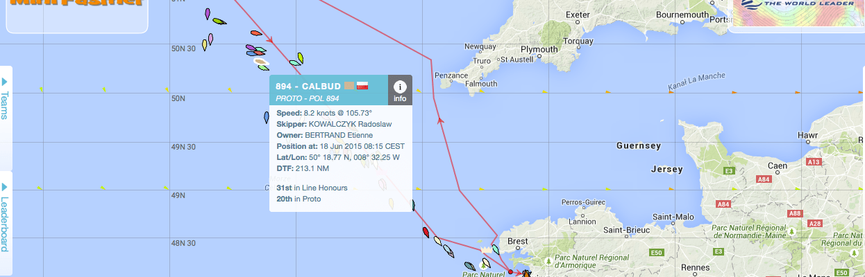 W drodze powrotnej od latarni Fastnet do portu w Douarnenez jachty Mini osiągają wyjątkowo duże prędkości. Wszystko dzięki umiarkowanej sile i wyjątkowo korzystnemu kierunkowi wiatru, umożliwiającemu żeglugę najszybszym kursem. Wczoraj szybkość niektórych jednostek przekraczała znacznie 10 węzłów, w niektórych przypadkach dochodząc prawie do 15. Średnia prędkość lidera wczoraj pomiędzy 0900 rano a 2100 wyniosła 13 węzłów, co jest wynikiem wyjątkowym, biorąc pod uwagę niewielkie rozmiary Mini.