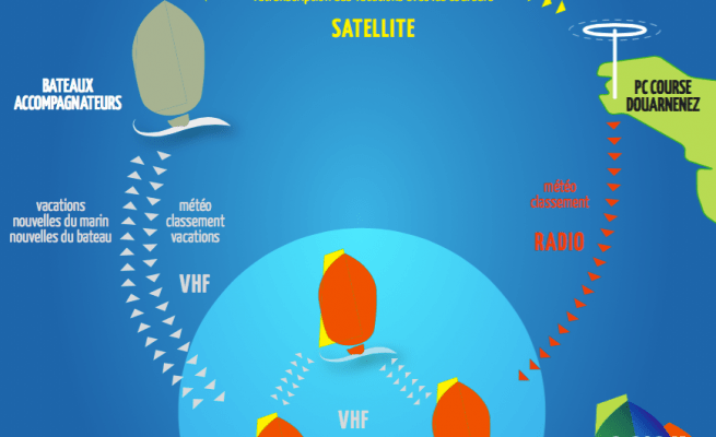 Schemat komunikacji obejmujący biuro regat, flotę Mini i jachty asystujące. / rys. Mini Transat 2015