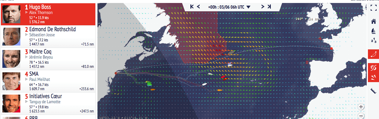 W trakcie ostatniej doby to właśnie on miał do czynienia z największą siłą sztormowego wiatru – centrum niżu znajduje się prawie nad Hugo Bossem, a prognozowane przemieszczanie się układu nie pozostawia żeglarzowi właściwie żadnego wyboru ani drogi ucieczki innej niż do przodu. (Na mapie w linku trzeba kliknąć do przodu na strzałkę przy dacie i czasie, żeby zobaczyć, jak będzie przemieszczał się niż.)